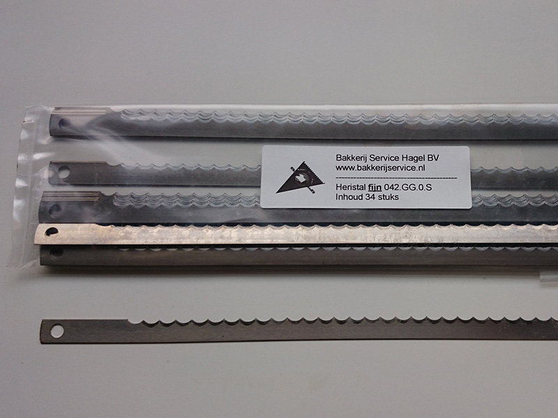 Deze broodsnijmachinemessen zijn geschikt voor Heristal broodsnijmachines. Deze messen zijn vervaardigd uit hoogwaardig staal en vervolgens op speciale wijze geslepen en bewerkt. Deze set bestaat uit 34 messen met een fijne kartel. Hiermee voorziet u een standaard machine met snijdikte 11 mm of groter compleet van nieuwe messen. Is uw snijdikte kleiner dan 11mm dan bent u 2 sets nodig. De totale lengte van de broodmessen is 271.8 mm en de breedte 9,5 mm, de hart op hart afstand is 257.8 mm en de bevestiging is doormiddel van gaten met een diameter van 5,5 mm.