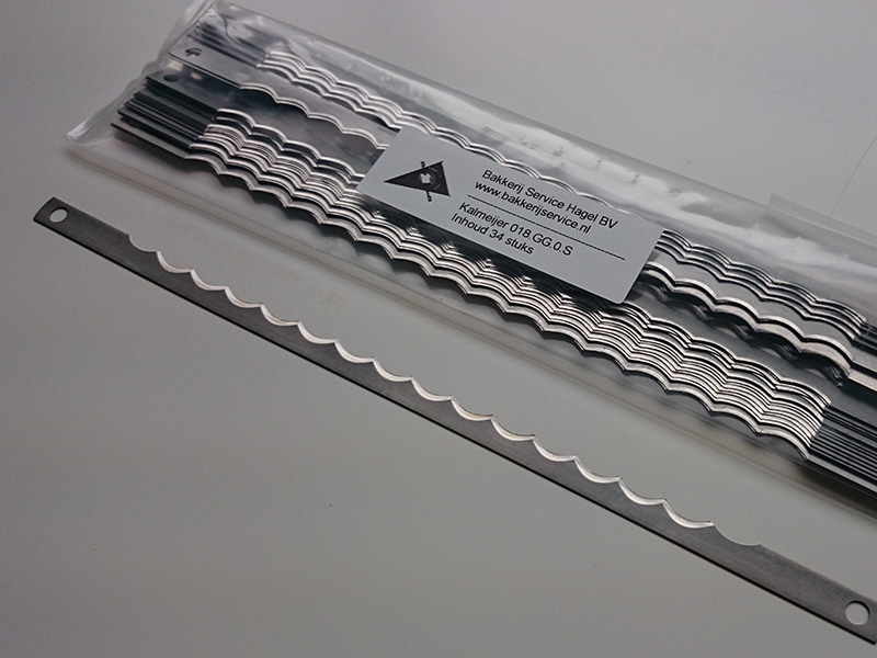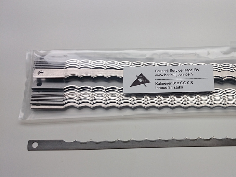 Deze broodsnijmachinemessen zijn geschikt voor Kalmeijer broodsnijmachines. Deze messen zijn vervaardigd uit hoogwaardig staal en vervolgens op speciale wijze geslepen en bewerkt. Deze set bestaat uit 34 messen met een grove kartel. Hiermee voorziet u een standaard machine met snijdikte 11 mm of groter compleet van nieuwe messen. Is uw snijdikte kleiner dan 11mm dan bent u 2 sets nodig. De totale lengte van de broodmessen is 268 mm en de breedte 10 mm, de hart op hart afstand is 254 mm en de bevestiging is doormiddel van gaten met een diameter van 5,5 mm.