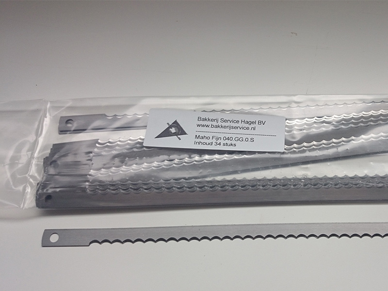 Deze broodsnijmachinemessen zijn geschikt voor Maho broodsnijmachines. Deze messen zijn vervaardigd uit hoogwaardig staal en vervolgens op speciale wijze geslepen en bewerkt. Deze set bestaat uit 34 messen met een fijne kartel. Hiermee voorziet u een standaard machine met snijdikte 11 mm of groter compleet van nieuwe messen. Is uw snijdikte kleiner dan 11mm dan bent u 2 sets nodig. De totale lengte van de broodmessen is 273,5 mm en de breedte 9,5 mm, de hart op hart afstand is 259,5 mm en de bevestiging is doormiddel van gaten met een diameter van 5,5 mm.